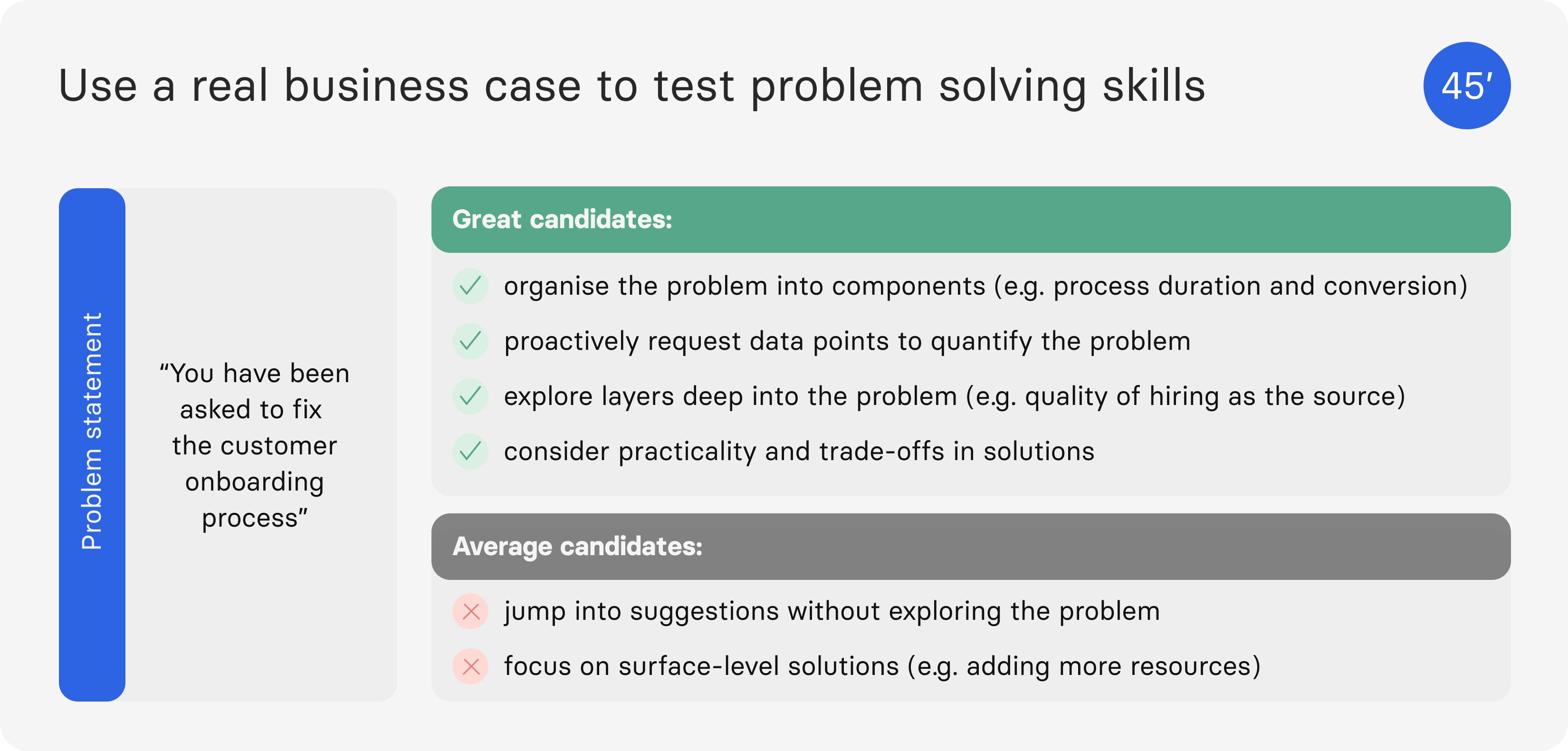 Example: A process is too slow. A strong candidate won’t just suggest process optimisations, they will dig deeper and discover that slow hiring is the root cause.